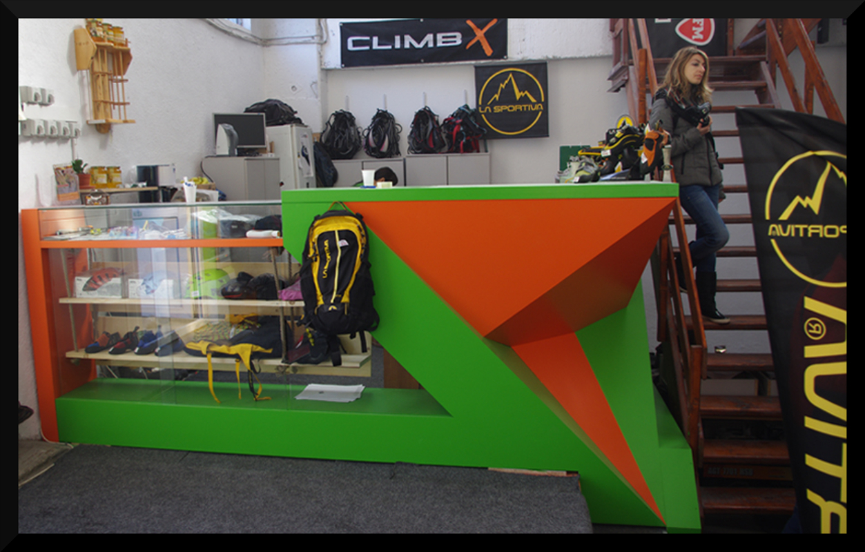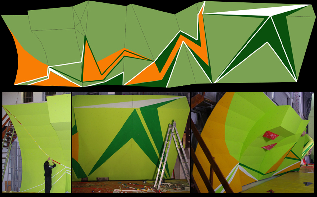Pentru noile suprafeţe de escaladă s-a dorit realizarea unei geometrii prezentând o variaţie mare de forme cu un unghi agresiv, tehnic. Pornind de la această formă am creat si geometria mobilierului recepţiei; acesta păstrează elementele de funcţionalitate ale oricarei recepţii, însă volumetria si imaginea lui sunt dedicate sălii de căţărare. În acelasi limbaj formal am realizat grafica panoului de bouldering, dorind a inspira dinamică volumelor existente.